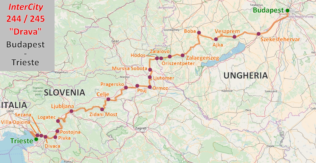| 15 dicembre 2002 | La relazione effettua la nuova fermata a Öriszentpeter. Nel senso Budapest - Venezia, il treno ferma anche a Logatec, ma non effettua più le fermate di Trbovlje e Zagorje. | |